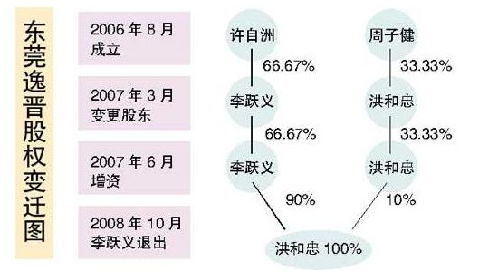 那么李躍義又是何時介入到東莞逸晉的呢?據東莞逸晉的公司決議,在2007年3月的一次股東會上,許自洲、周子健以原出資金額將手上的全部股權分別轉給了李躍義和洪和忠。轉讓后,李躍義獲得了許自洲手上的66.67%股權。隨即,公司章程也進行了修改,李躍義擔任了公司唯一一名執行董事、經理和法定代表人。