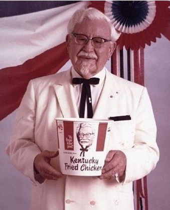 創始人桑德斯上校創辦肯德基時66歲,靠每月的$105社保生活。在肯德基獲得成功而接受電視臺采訪時,他找出自己唯一一套干凈的、白色棕櫚裝,從此這一打扮成為他獨特的標識造型,并以此注冊商標。從此以后,人們便將這套西裝與肯德基聯想在一起;而他的這身白西裝,滿頭白發,及山羊胡子也成為了全國性的象征。因為生意做的好,肯德基州長于1935年封他為肯德基上校,以表彰他對肯德基州餐飲的貢獻。