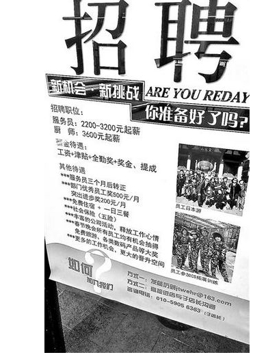 在朝陽區藍色港灣餐飲街,“高薪誠聘服務員”的字樣隨處可見,有的餐廳為了吸引人員應聘,甚至將年會抽獎、員工日本游、CS拓展訓練等福利信息放在招聘廣告上,但這樣依然難解用工緊張局面,一些向來只招年輕服務員的飯店也不得不把招聘條件放寬至“阿姨級”。