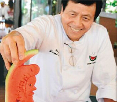 在整個西瓜節(jié)上最引人注目的是雕西瓜活動,廚師們紛紛大展雕工,而華裔廚師潘國強最受注目。兩周前剛剛在一個60萬廚師參加的美國廚師比賽上獲得2014年度廚師稱號的潘國強,是歷史上唯一獲得此獎項的華裔廚師。在他的刀下,各種造型被雕刻得栩栩如生,從熱帶魚到中國龍,從玫瑰花到小兔子,快的時候只用20秒就可以雕出讓人驚嘆的西瓜藝術(shù)品。