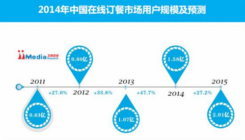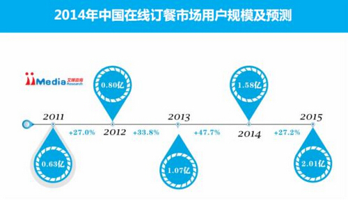 iiMedia Research數(shù)據(jù)顯示,2013年中國(guó)在線訂餐市場(chǎng)用戶規(guī)模達(dá)到1.07億,預(yù)計(jì)2014年中國(guó)在線訂餐用戶規(guī)模將達(dá)到1.58億。