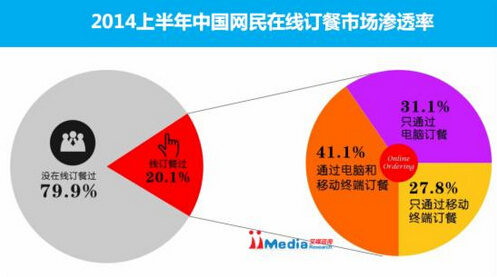 iiMedia Research數(shù)據(jù)顯示,2014年上半年中國(guó)網(wǎng)民在線訂餐滲透率達(dá)到20.1%。在訂餐網(wǎng)民中,有27.8%只通過手機(jī)、平板等移動(dòng)終端進(jìn)行訂餐,只通過電腦訂餐的占31.1%。