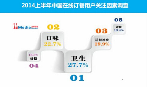 iiMedia Research數(shù)據(jù)顯示,2014年上半年中國(guó)在線訂餐用戶關(guān)注因素方面,食物衛(wèi)生、口味、送餐速度最受用戶關(guān)注,占比分別為27.7%、22.7%、19.9%。iiMedia Research分析認(rèn)為,在線訂餐用戶需求比傳統(tǒng)餐飲消費(fèi)更復(fù)雜和碎片化。