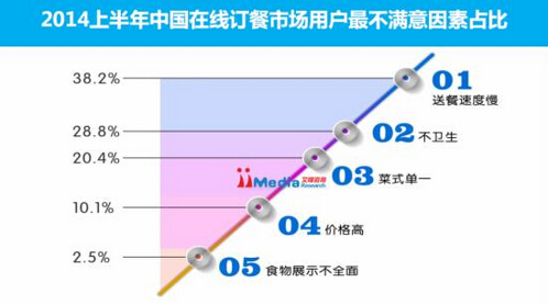 iiMedia Research數(shù)據(jù)顯示,38.2%的用戶將送餐速度慢列為在線訂餐最不滿意的因素,其次是不衛(wèi)生,有28.8%的用戶將其列為最不滿意的因素。