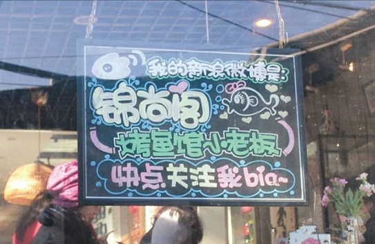 烤魚店開在胡同里,曲徑通幽,但人流量畢竟有限,作為廣告系畢業(yè)生的唐棠如何來推廣宣傳自己呢?唐棠介紹,她開店那會兒,趕上微博熱,于是她立即注冊了一個(gè)微博號,用戶名是“錦尚閣烤魚館小老板”,并附上自己的訂餐電話。在微博里,她每天勤勤懇懇地更新,內(nèi)容不全是店里的廣告,而是很多開店的趣事以及自己的生活片段,比如有一條微博是這樣寫的:“員工因家鄉(xiāng)不同,一會兒有離職要去收麥子的,一會兒有離職要去敲松子的,一會兒又有要回家收玉米的……導(dǎo)致我現(xiàn)在對農(nóng)廣天地的收獲時(shí)段了如指掌”;“來了一個(gè)帥得飛起來的男孩兒,女服務(wù)員們都瘋起來、爭著要服務(wù)這一桌,我批評了她們:服務(wù)行業(yè)怎么能失態(tài)不淡定!怎么能區(qū)別對待!你們知不知道,店是我的,你們是我的,好看的男客人也是我的!這桌我來服務(wù),你們都忙別的去吧……”這些詼諧有趣的情節(jié)以及老板的美照俘獲了眾多同齡人的心,目前她的微博共吸引了5000多名粉絲。唐棠說:“只要勤更新,微博的宣傳效果的確非常顯著而且很持久,開店沒多久,粉絲們就源源不斷地上門來品嘗烤魚,有很多人成了小店的回頭客。到現(xiàn)在,我的新浪微博名字一直寫在小黑板上,掛在店外,來回經(jīng)過的路人有時(shí)候也忍不住好奇心關(guān)注我的微博,變成潛在客戶。”