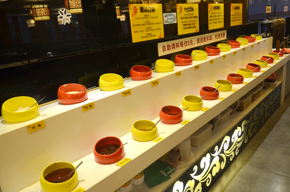 調(diào)料是自助的,品種很多,可以按自己的口味自行調(diào)配,每人5元!