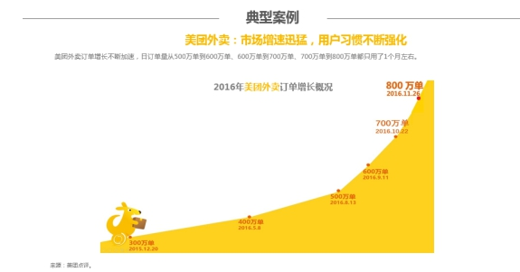報告指出,外賣O2O市場增速迅猛,用戶習慣不斷強化。以美團外賣為例,通過美團外賣APP、美團、大眾點評、手機QQ、微信等多元化的入口引流,截至今年9月,月活躍用戶數(shù)高達8,018萬人。目前,美團外賣的日訂單量更是超過了800萬單,其中,日訂單量從500萬單到600萬單、600萬單到700萬單、700萬單到800萬單的增長都只用了1個月左右。