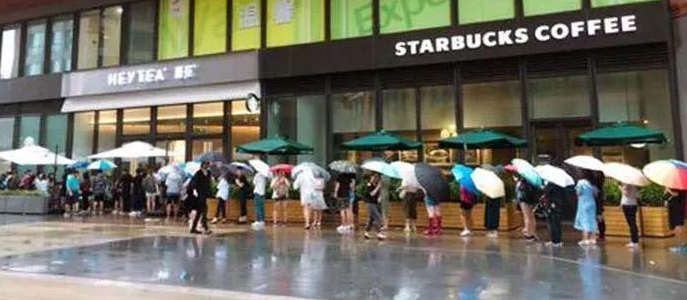 ▲ 購(gòu)買喜茶的隊(duì)伍從星巴克門口經(jīng)過(guò)