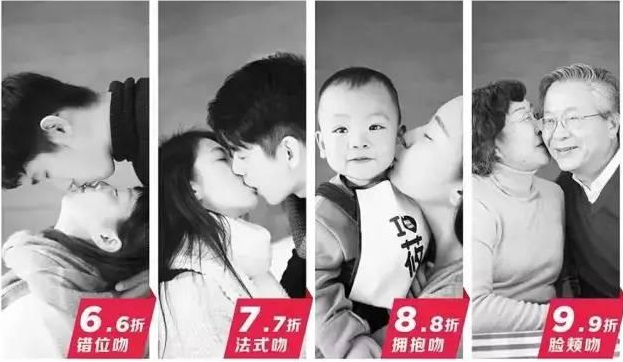“西貝”為“親嘴打折節(jié)”準備了一個極其吸引眼球的廣告語“吻得越深,折扣越大”,并設(shè)計了四種不同的親吻姿勢和對應折扣。別出心裁的打折方式,給了中國人一次公開高調(diào)秀恩愛的機會!