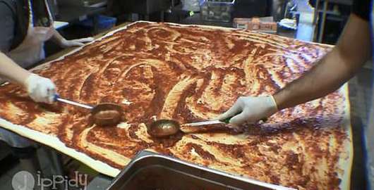Big Mama‘s&Papa’s的助理經(jīng)理阿信•格雷戈里(Oshin Gregory)詳細(xì)解釋了巨型披薩的制作過程:廚師將七塊傳統(tǒng)大小的面團(tuán)堆疊在一起,鋪開后加入沙司,然后放入烤箱中烤兩分鐘取出,再加入奶酪和配料,最后將披薩切成小塊準(zhǔn)備送貨。