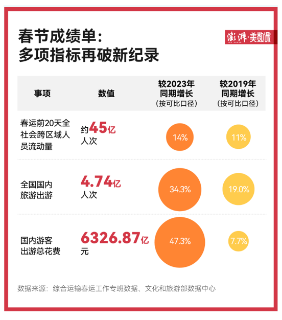 經文化和旅游部數據中心測算,2024年春節假期8天全國國內旅游出游4.74億人次,同比增長34.3%,按可比口徑較2019年同期增長19.0%;國內游客出游總花費6326.87億元,同比增長47.3%,按可比口徑較2019年同期增長7.7%。