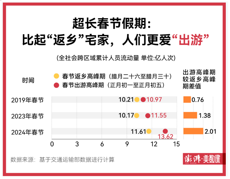 澎湃新聞基于交通運輸部公布的每日全社會跨區域人員流動量數據進行計算,發現和2019年、2023年同期相比,今年春節出游高峰期的人員流動更頻繁。