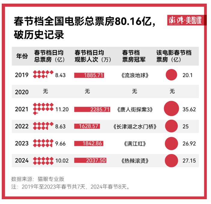 國家電影局2月18日發布的數據顯示,2024年國內春節檔電影票房達80.16億元,創造了新的春節檔票房紀錄,觀影人次為1.63億。